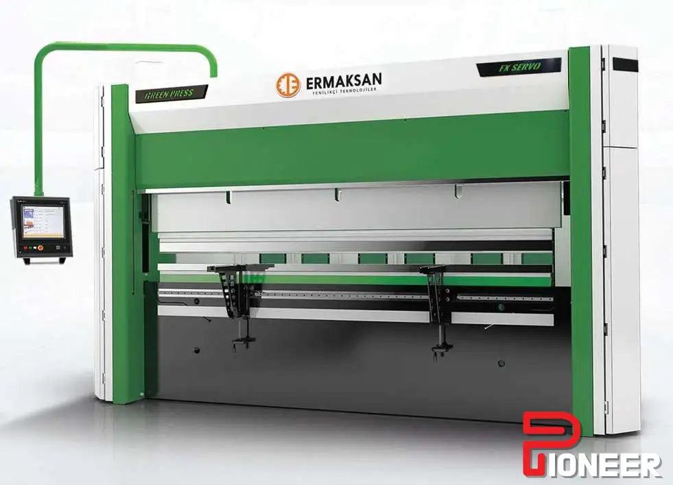 New Ermaksan Green Press FX Servo 1003: advanced CNC, 4-axis backgauge, quick clamp tool holder, high stroke & daylight, safety features, front support, English manual.